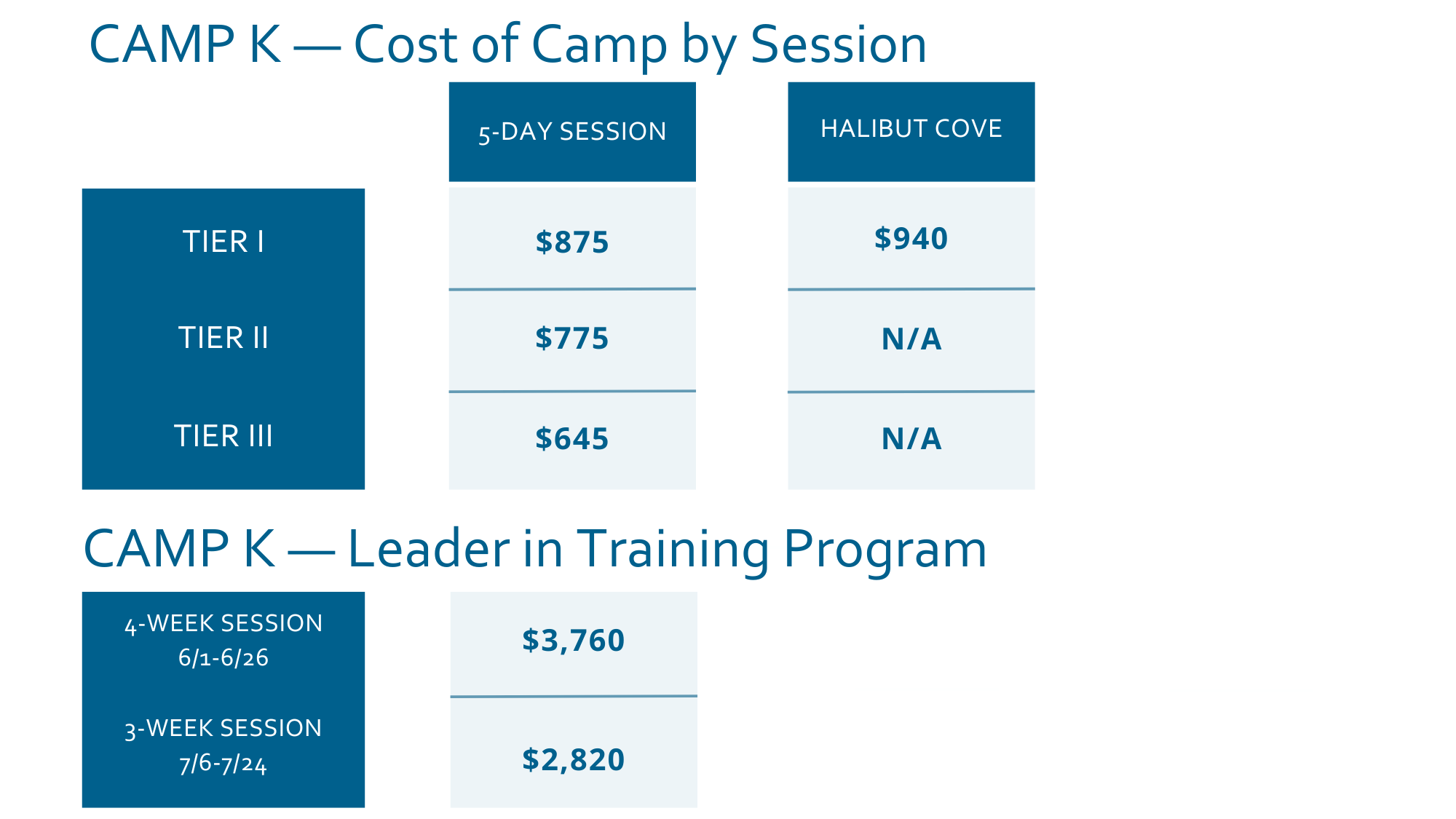 Tier II—Partially Subsidized Rate. This is the mid-tier rate that helps to offset Camp K’s operating costs, but does not reflect the true cost of operating summer camp programs.